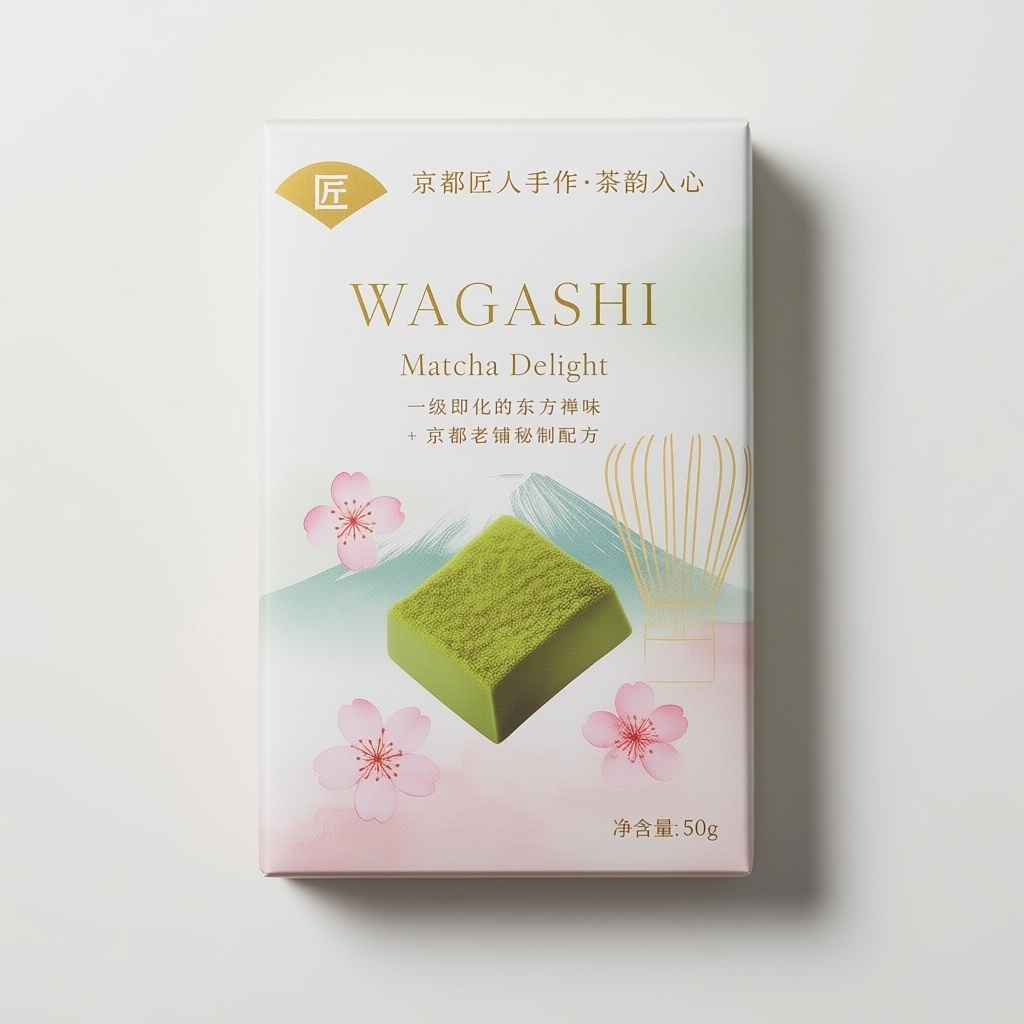 产品:日式风味手工巧克力;品牌名:WAGASHI;包装样式:竖立长方体纸盒,选用哑光特种纸呈现温润触感;包装营销卖点:以“京都匠人手作·茶韵入心”为核心,突出原料溯源与工艺匠心;包装主视觉面排版:上下排版,主标题“WAGASHI”居上,字体为纤细衬线体24pt,副标题“Matcha Delight”10pt,二级宣传语“一抿即化的东方禅味”+“京都老铺秘制配方”各8pt,净含量“50g”置于右下角6pt;背景层为富士山柔雾渐变纹理,主图案为写实水彩风抹茶巧克力居中偏下,表面微露茶粉肌理,四周散落三朵工笔樱花,左上角嵌一枚金色小扇形图标内书“匠”字,右侧饰以极细金线勾勒的茶筅轮廓;设计风格:日式简约清新雅致;主题配色:主色抹茶绿,辅色樱花粉与米白。