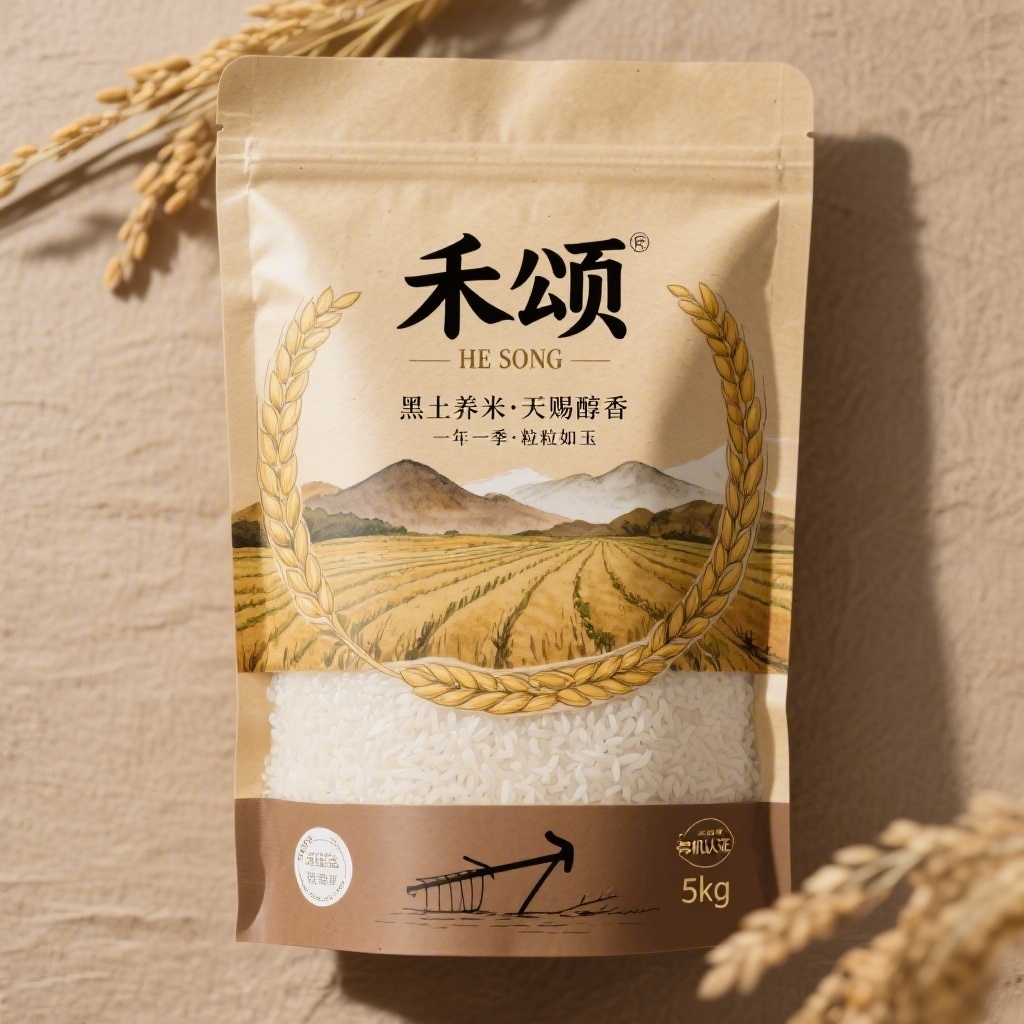 产品:五常有机长粒香米;品牌名:禾颂;包装样式:牛皮纸自立袋,纸面微糙触感显天然质感;包装营销卖点:以“黑土地孕育·一年一季好米”为核心,强调原产地稀缺性与农耕仪式感;包装主视觉面排版:上下排版,主标题“禾颂”黑体粗字60pt居上,副标题“HE SONG”衬线体12pt,二级文字“黑土养米·天赐醇香”+“一年一季·粒粒如玉”各8pt分列两侧,净含量“5kg”置于右下角,小图标含“有机认证”“非转基因”字样;设计元素图案:背景层为浅褐肌理纸纹模拟稻田土壤,主图案采用水彩天然风绘制五常稻浪与远山轮廓,装饰图案为金色麦穗线描环绕袋口,底部缀以手绘农具剪影,小图标嵌于左下角白底圆章内;设计风格:自然质朴融合轻奢手绘感;主题配色:主色大地棕、辅色稻穗金。