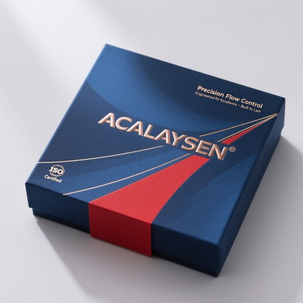 产品:三角阀;品牌名:阿卡莱森ACALAYSEN;包装样式:精品礼盒,尺寸10.5×6×6.5cm,选用高克重哑光艺术纸,触感细腻显高级;包装营销卖点:以品牌英文商标“ACALAYSEN”为核心视觉符号,通过艺术化变形强化专业与国际感;包装主视觉面排版:采用覆盖式排版,背景层为深蓝渐变晕染肌理,中央主图案是拉长流线型的“ACALAYSEN”字母组合,采用金属质感立体字风格,辅以细金线勾边装饰,底部衬红色几何色块增强视觉锚点,右上角嵌入“Precision Flow Control”副标题(无衬线体8pt),下方配二级宣传语“Engineered for Excellence·Built to Last”(现代黑体6pt),左下角设认证图标内含“ISO Certified”字样;设计风格:高端商务风,强调极简构成与品牌符号张力;主题配色:主色深邃蓝,辅色中国红。