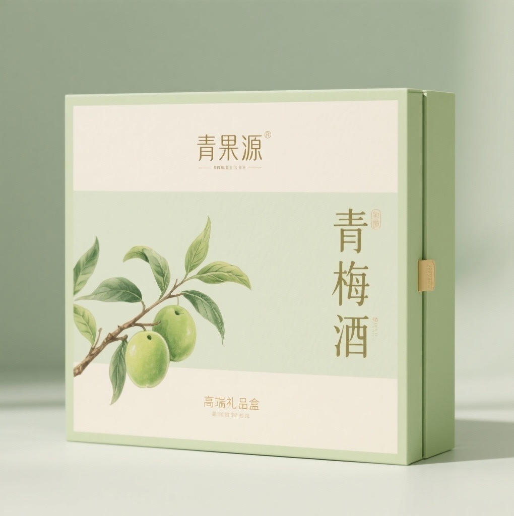 - **产品**:青梅酒 - **品牌名**:青果源 - **包装样式**:礼品盒 - **设计风格**:简约自然风 - **设计元素**:手绘青梅插画(枝叶鲜活)、简约字体文字(“青梅酒”字样) - **主题配色**:淡绿色、米白色