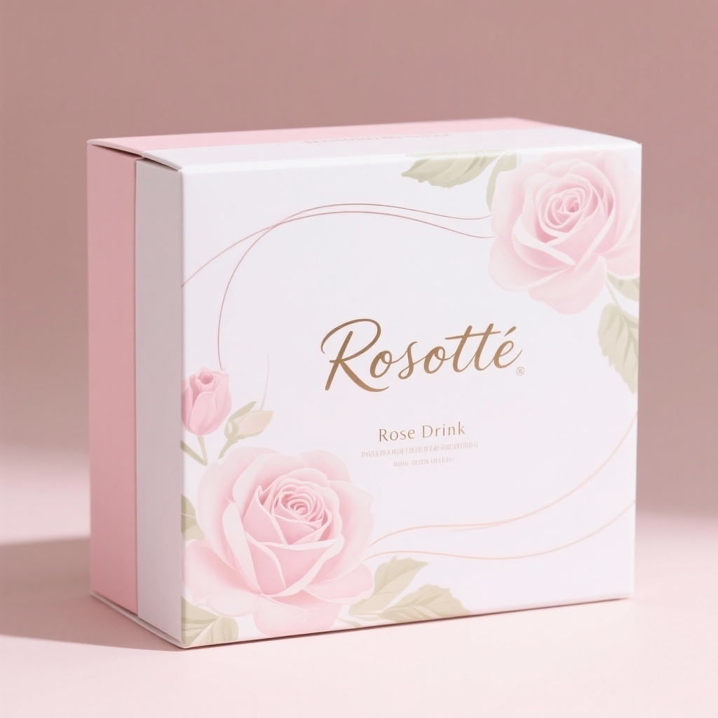 **产品**:玫瑰饮 **品牌名**:Rosette **包装样式**:礼品盒 **设计风格**:浪漫优雅 **设计元素**:玫瑰花卉图案、柔美曲线线条、手写品牌字体 **主题配色**:浅粉色和白色