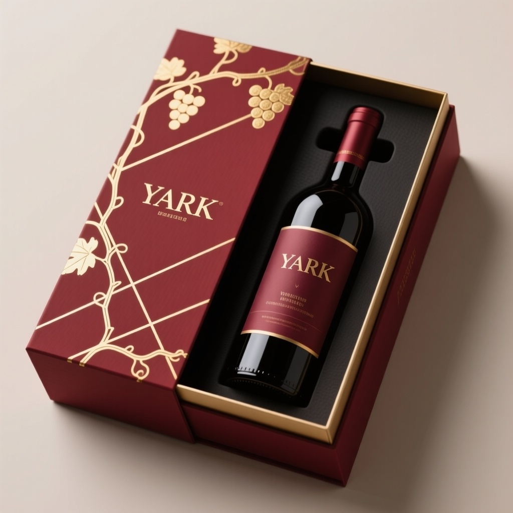 - **产品**:红酒瓶 - **品牌名**:YARK - **包装样式**:礼品盒 - **设计风格**:现代轻奢极简风 - **设计元素**:烫金葡萄藤蔓几何线条、哑光材质基底 - **主题配色**:勃艮第红 / 沙金色 / 岩黑哑光