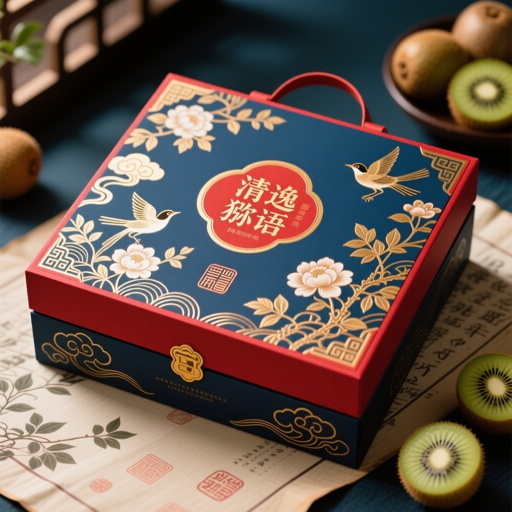 - **产品**:猕猴桃水果 - **品牌名**:清逸猕语 - **包装样式**:礼品盒 - **设计风格**:中式古典风 - **设计元素**:工笔花鸟纹样、云纹浮雕、篆刻印章、宣纸质感底纹 - **主题配色**:黛蓝配朱砂红,局部烫金点缀