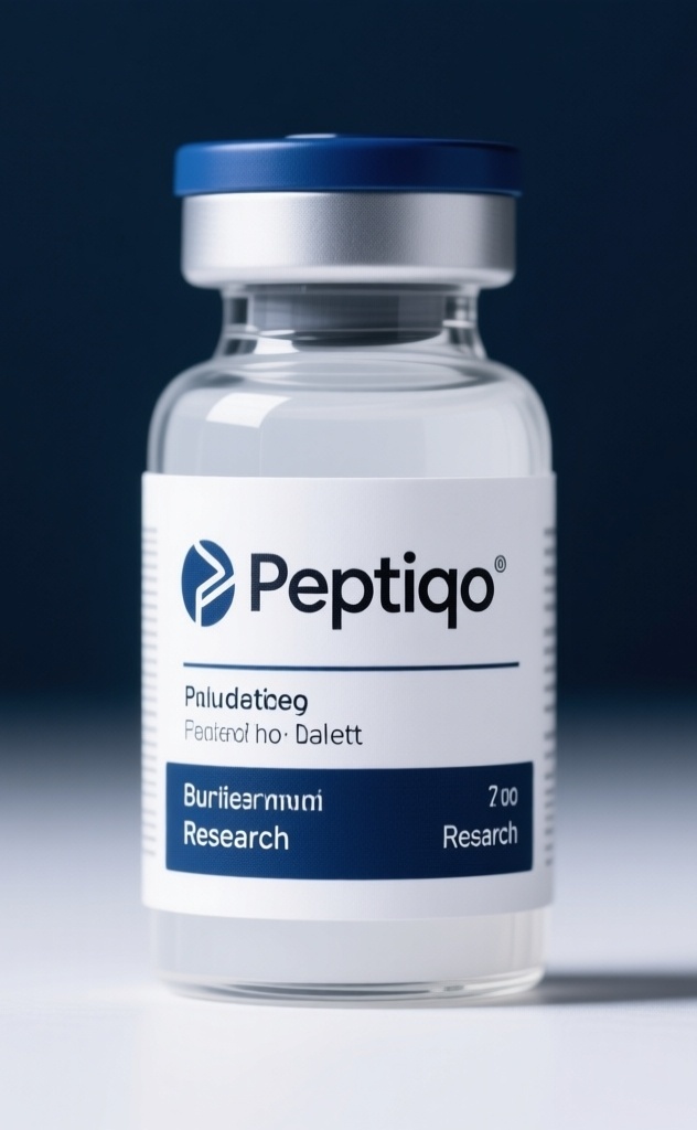 - **产品**:注射药剂瓶标签 - **品牌名**:Peptiqo - **包装样式**:瓶身标签 - **设计风格**:极简风格 - **设计元素**:品牌标识、药剂名称、纯度信息、剂量信息、研究用途提示 - **主题配色**:白色背景搭配深蓝色文字