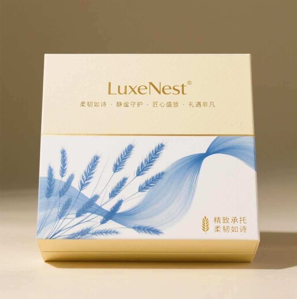 - **包装主视觉面排版**:上下排版——顶部居中放置品牌名“LuxeNest”采用烫金工艺大字,下方配以四组四字短语“柔韧如诗·静谧守护·匠心盛放·礼遇非凡”横向排列;底部三分之二区域为抽象化的蓝色拉菲草飘逸图案,从右下角向左上蔓延,营造动感与层次,文字与图案间留白过渡自然。