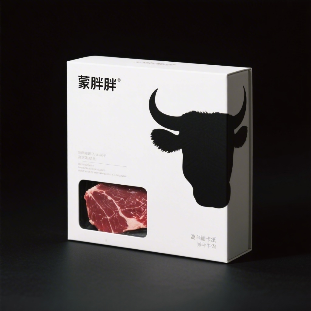 - **产品**:牛肉 - **品牌名**:蒙胖胖 - **包装样式**:硬卡纸盒 - **设计风格**:极简高级+写实摄影风 - **设计元素**:写实风格牛头剪影或局部特写、无衬线字体品牌标识、负空间构图留白、精致信息层级排版 - **主题配色**:纯白、炭黑、暗红